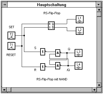 Grundlage vieler Speichertechnologien sind Flip-Flops. Der Name deutet schon an, daß es sich hierbei um Schaltungen mit zwei stabilen Zuständen AN (Flip) und AUS (Flop) handelt. Verschiedene Varianten liegen in DigiTrace als fertige Bauteile vor, sie können aber auch aus einzelnen Gattern aufgebaut werden, um ihre Funktion genauer zu beleuchten. Das Beispiel zeigt ein RS-(Reset/Set) Flip-Flop und seinen Aufbau aus Gattern. Die Schaltung ermöglicht ein leichtes Verstehen der inneren Funktion eines Flip-Flops.