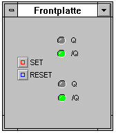 Die Funktion der Schaltung läßt sich leicht beschreiben: Mit SET wird der Q-Ausgang gesetzt, mit RESET der /Q-Ausgang. Der letzte Zustand bleibt jeweils solange erhalten (gespeichert), bis er durch eine weitere Betätigung geändert wird. Auch für das RS-Flip-Flop gibt es reale Anwendungen. So ist es z.B. üblich, größere Maschinen über zwei Tastschalter für An und Aus zu bedienen. Statt der simulierten Schalter und LEDs auf der Frontplatte lassen sich problemlos reale Elemente am SIOS-Interface oder CompuLAB einsetzen.