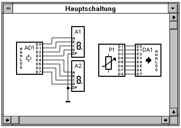 Mit DigiTrace lassen sich auch komplexere Schaltungen mit Daten-bus-Systemen, Speichern, Adreß-zählern usw. aufbauen. So werden auch AD- und DA-Wandler simuliert bzw. real angesteuert. Das folgende Beispiel stammt ebenfalls aus der CD zum erwähnten Buch. Es verwendet einen Analogeingang und stellt das Ergebnis von acht Digitalzuständen an einer hexadezimalen Anzeige dar. Auf der anderen Seite wird über ein Poti mit (gedachtem) AD-Wandler ein 8-Bit-Bussystem gesteuert, das wiederum über einen DA-Wandler in eine Spannung umgesetzt wird. In einem praktischen Versuch wird der Schaltung je ein Analogeingang und ein Analogausgang des SIOS-Interfaces zugeordnet. Beide werden dann mit einem Kabel verbunden. Nach dem Start der Simulation läßt sich über das Poti an der virtuellen Frontplatte die reale Spannung am Analogausgang des SIOS einstellen. Gleichzeitig erscheint der wieder eingelesene Spannungswert in hexadezimaler Form in der Anzeige.