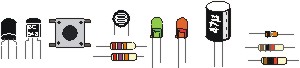 Bei den mitgelieferten Komponenten handelt es sich um 2 Transistoren, einen Taster, 4 Widerstände, einen lichtempfindlichen Widerstand, 2 Leuchtdioden, einen Kondensator und eine Diode. Diese Komponenten werden direkt in die Buchsen gesteckt. Für weitere Verbindungen ist eine Rolle Schaltdraht vorgesehen.