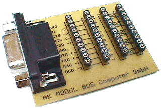 Der Anschluß der elektronischen Bauteile an den Computer erfolgt über eine kleine Platine. Diese verlängert die einzelnen Signalleitungen der seriellen Schnittstelle und führt sie der doppelten Buchsenleiste in der Mitte der Platine zu. Die rechts daneben liegenden Buchsenleisten stellen ein kleines Experimentierfeld da, auf dem entsprechend der Zeichnung jeweils vier Buchsen miteinander verbunden sind.