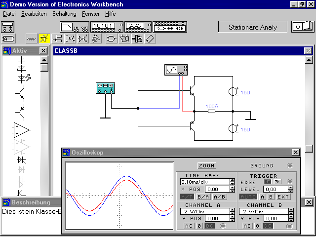 Die Simulation eines Gegentaktverstärkers zeigt die typischen Übernahmeverzezzungen beim Betrieb ohne Ruhestrom. Auch die Transistoren können aus einer längeren Liste ausgewählt werden. Man kann also den geeigneten Typ für eine Schaltung aussuchen, bevor man ihn einlötet.